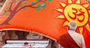 The saffron-coloured flag bears the image of a radiant sun, with an 'Om' inscribed on it along with the image of a Kovidara tree.