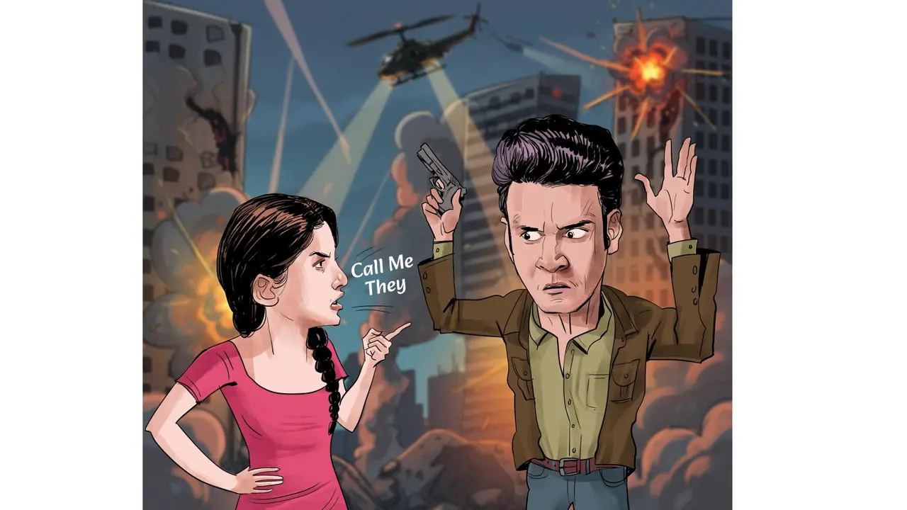 The son, with an irritated eye roll explains, See Pa, Dhriti equals they Dhriti likes to be called they, them not she, her.