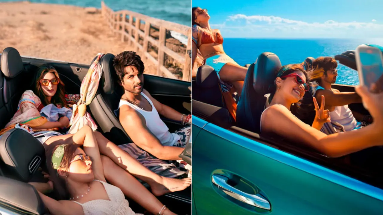 The new posters feature Shahid Kapoor, Kriti Sanon, and Rashmika Mandanna inside a car, set against a picturesque coastal backdrop with a clear blue ocean, a sandy beach