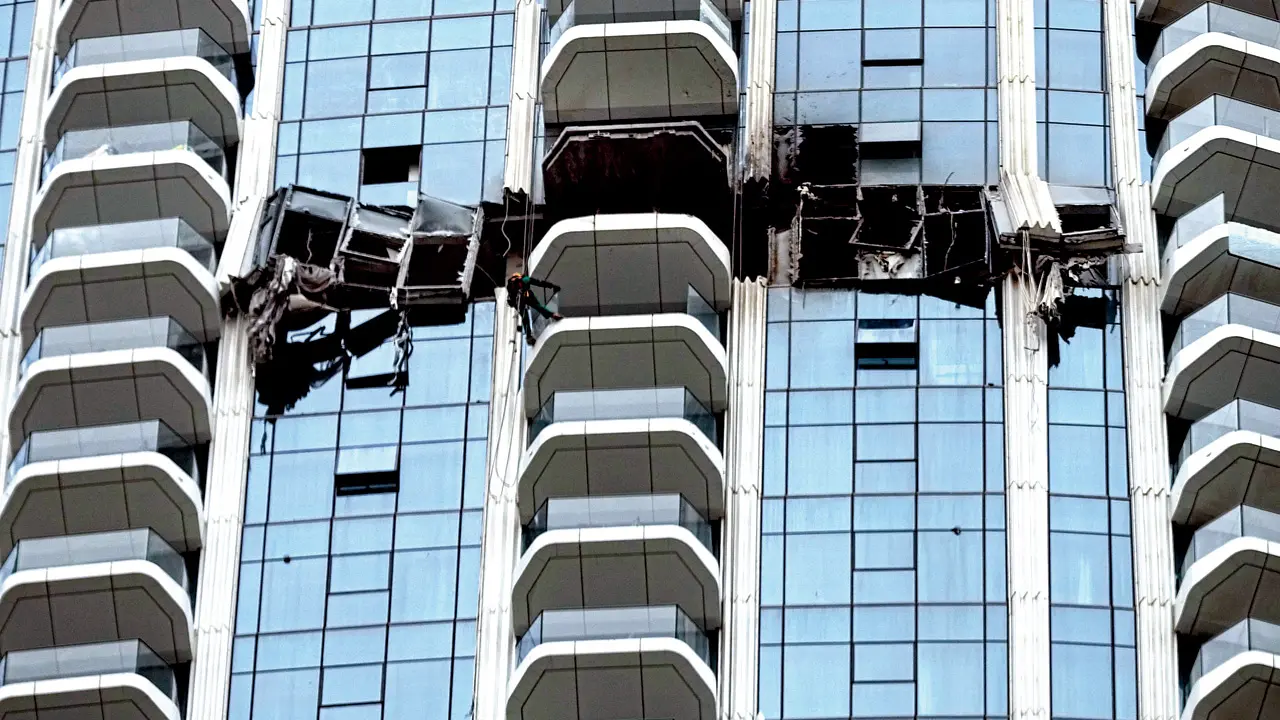 Two loud blasts rattled buildings in Dubai after air defences intercepted an incoming attack, sending debris into a central district, authorities said