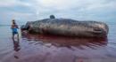 A resident carries a child while observing the carcass of a stranded sperm whale (Physeter macrocephalus) on the coast ...
