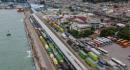 An aerial view shows trucks queuing while waiting to load and unload at Merak Port, Cilegon, Banten, Wednesday (March ...
