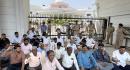 Members,wearing black ribbons tied across their foreheads, gather at Sardar Vallabhbhai Patel Chowk to set ablaze an effigy and a poster